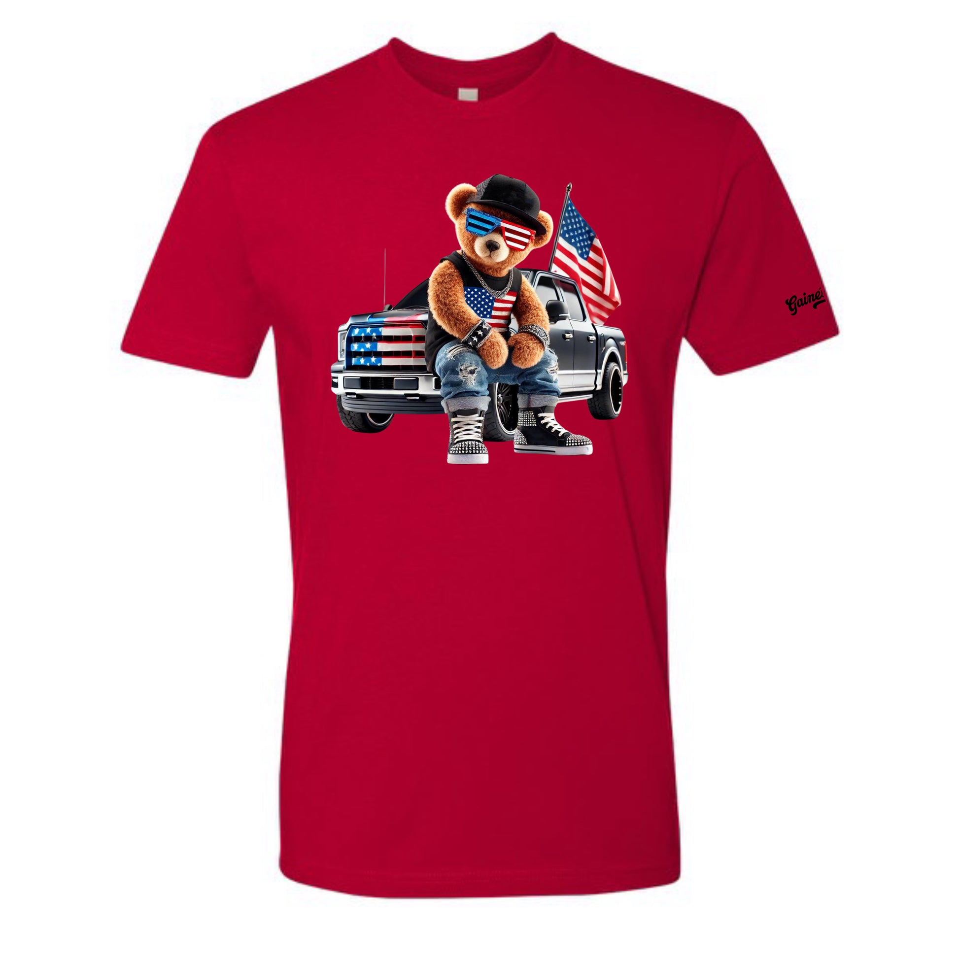 Show your patriotism for USA with a Patriot Gainester Bear shirt. The left sleeve has a classic Gainester print and our #33 is proudly represented on the lower back right side.